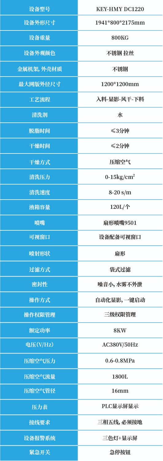 2、设备采用前后双喷杆高精密喷淋显影系统,网版前后同时喷淋作业;